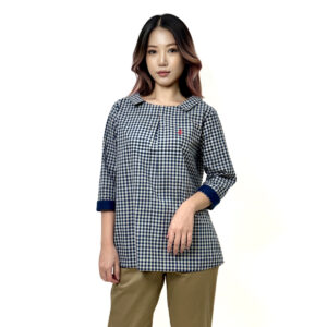 Gingham 3/4 Sleeves Blouse (55% Cotton, 45% Polyester) (Navy)