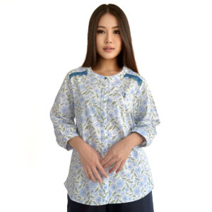 Blue Floral Button-Up 3/4 Sleeve Shirt (50% Cotton, 50% Rayon) (Blue)