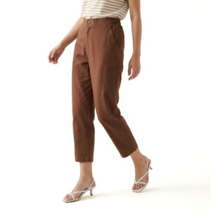 Slim-Straight Linen Cropped Trousers (Cotton 70% & Linen 30%) (Brown)