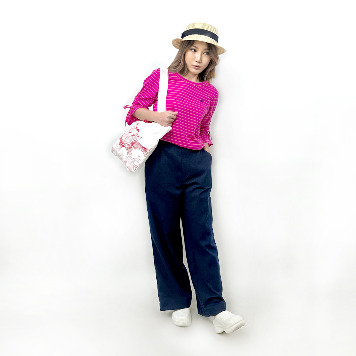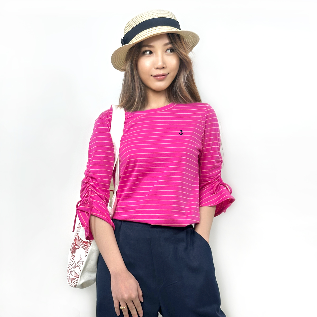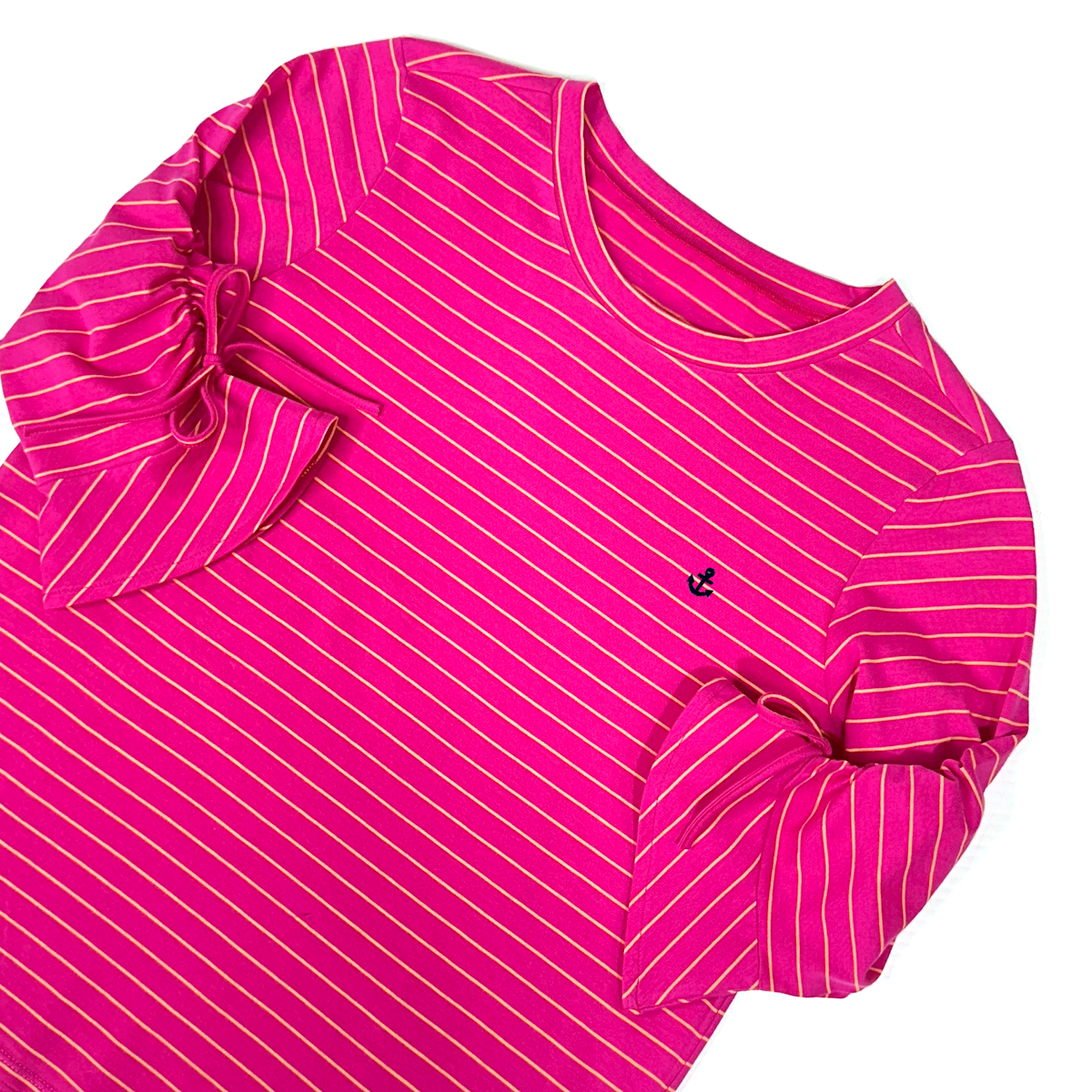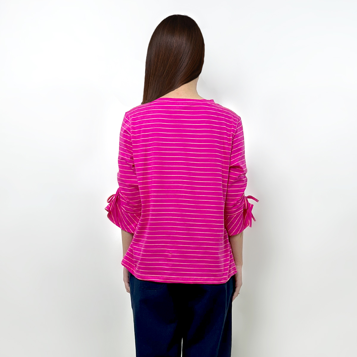 3/4 Bell Sleeves Striped T-Shirt (55% Cotton, 45% Polyester) (Fuchsia pink)