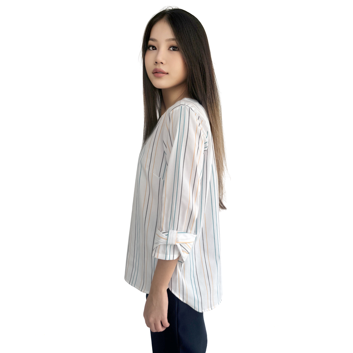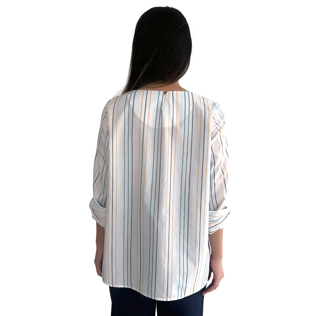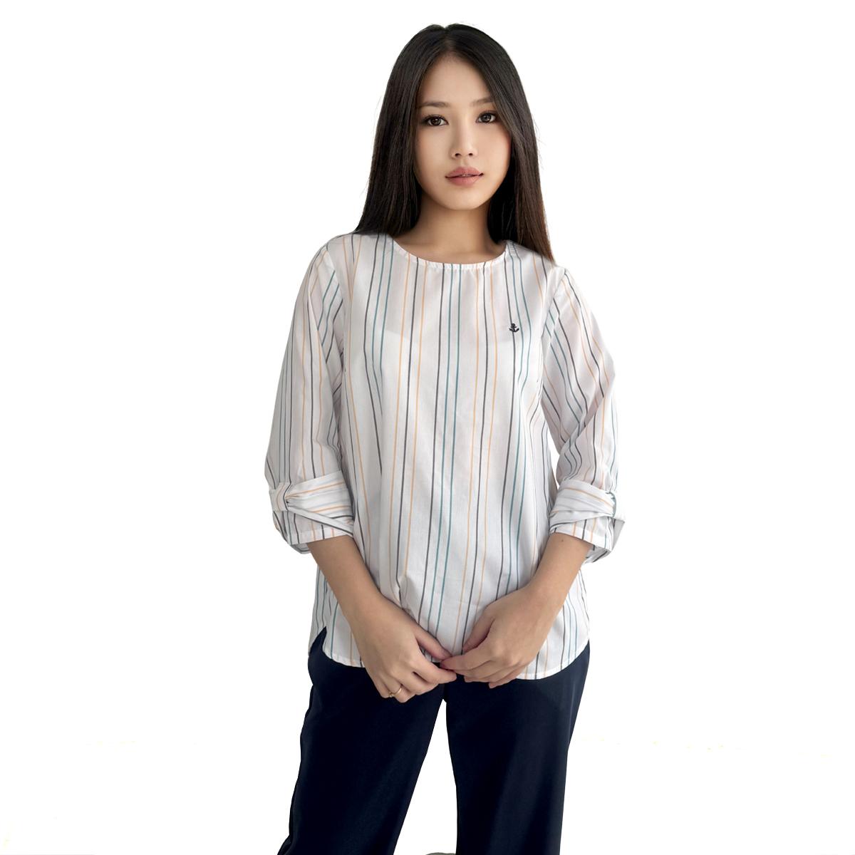 3/4 Sleeves Detail Stripe Top With Embroidery ( 50% Cotton, 50% Rayon) (White)