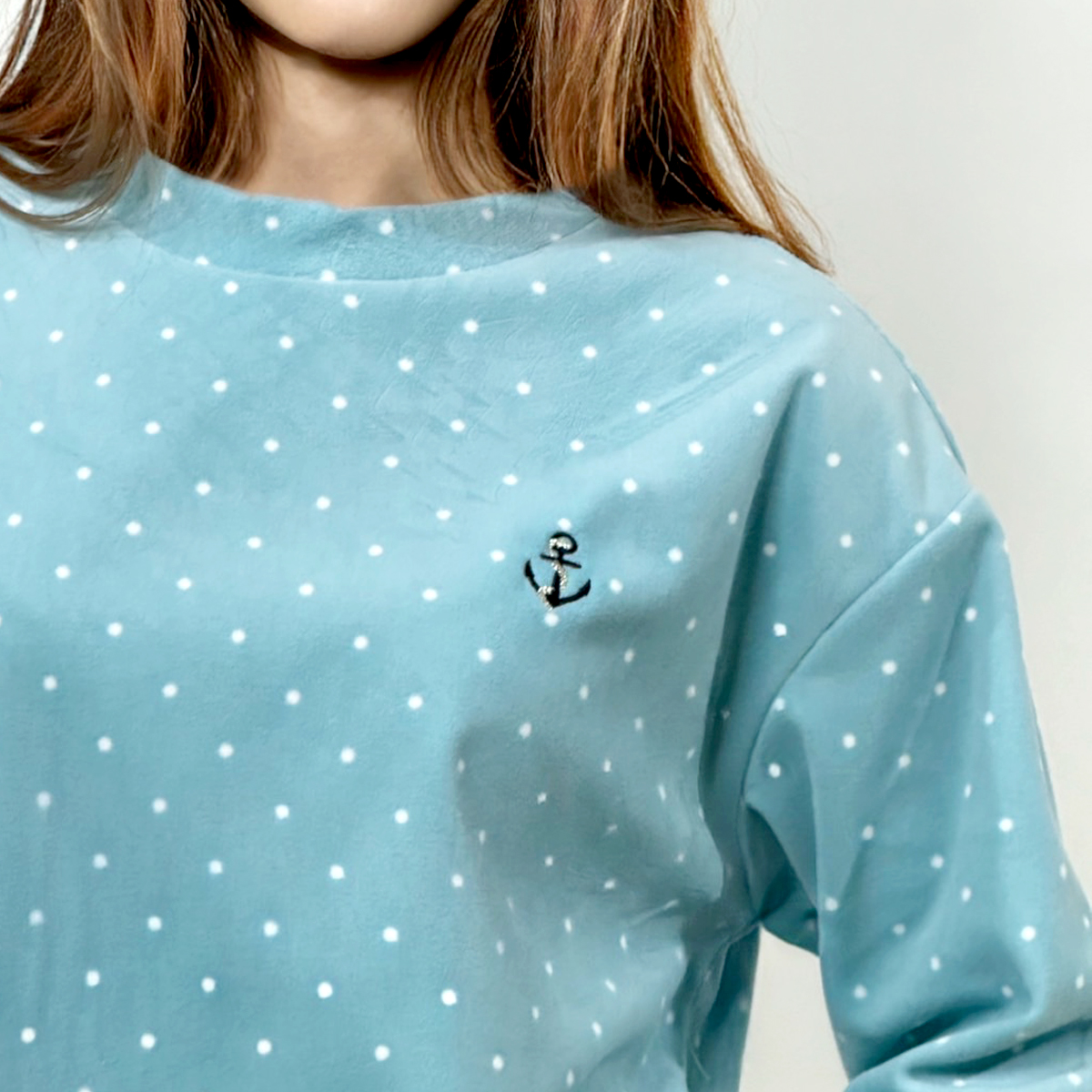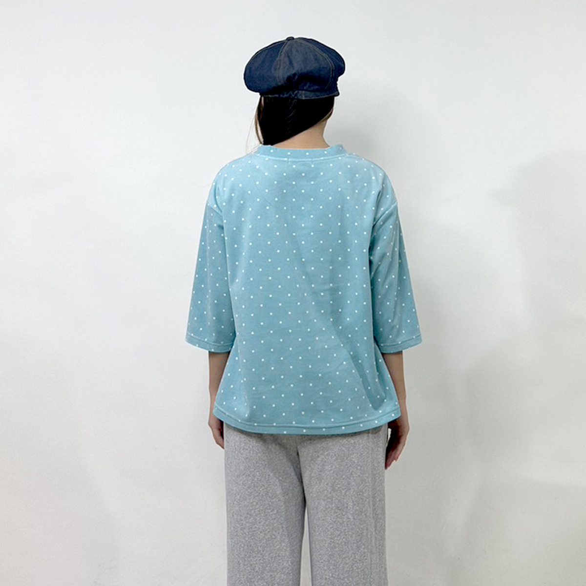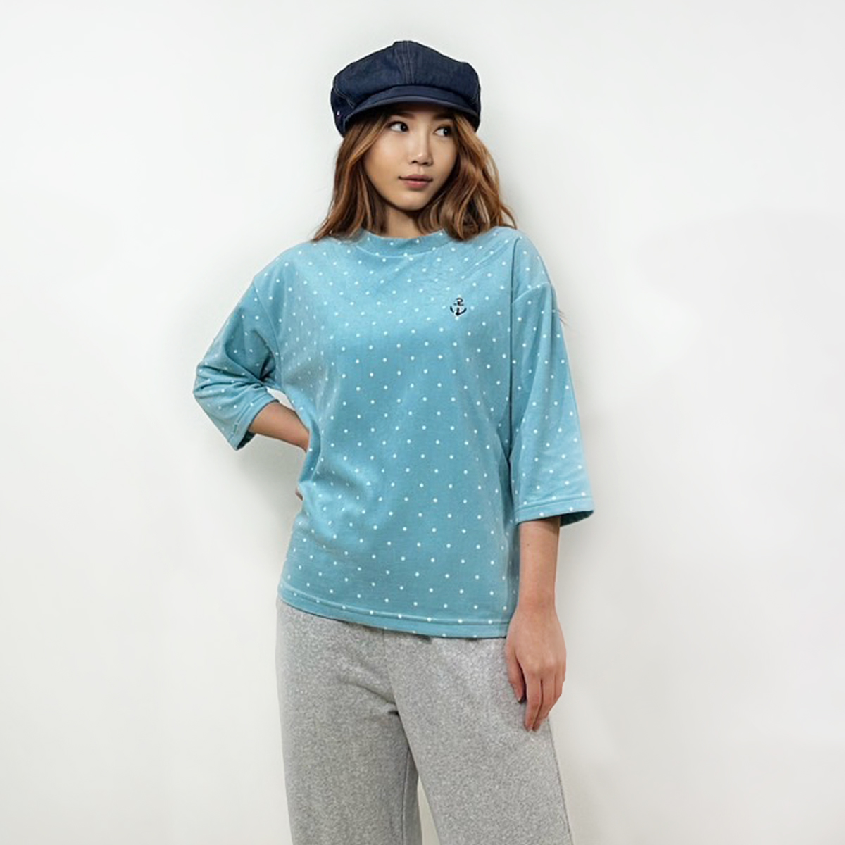 3/4 Sleeves High Neck Polka-Dot T-Shirt (65% Polyester, 35% Cotton) (Blue)