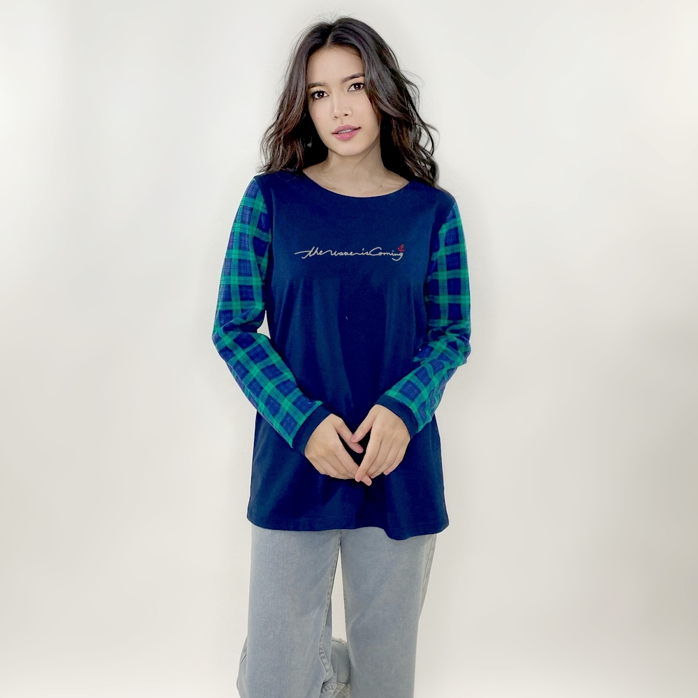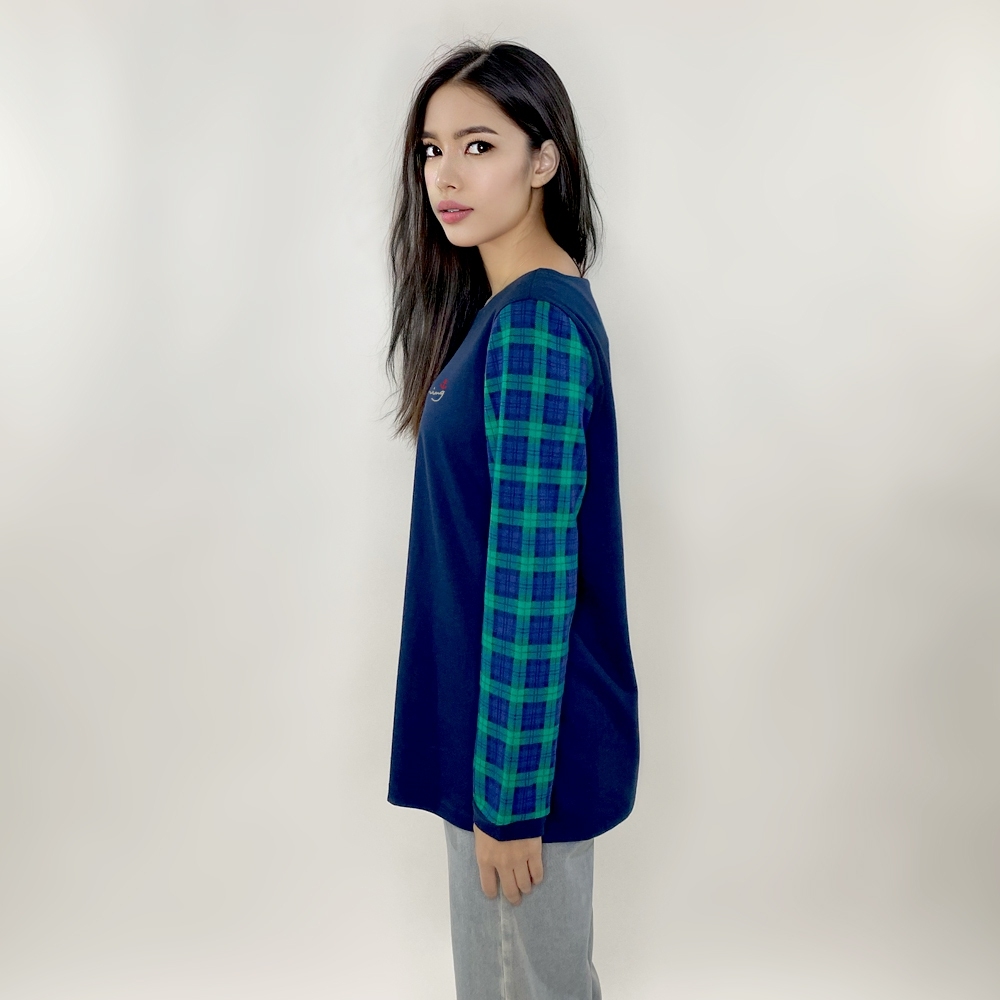 *สั่งซื้อเฉพาะในเว็ปไซต์* Flannel Checked Sleeve Knit Tunic (Navy)