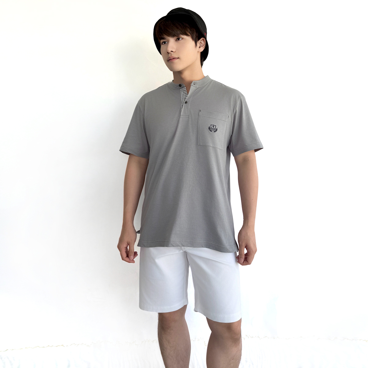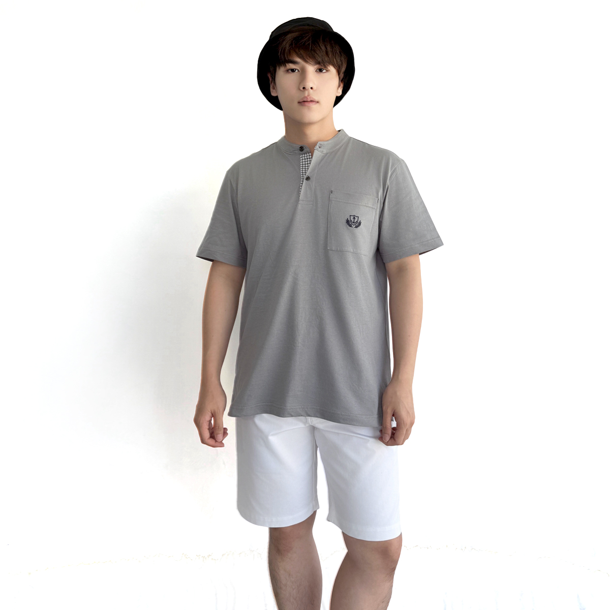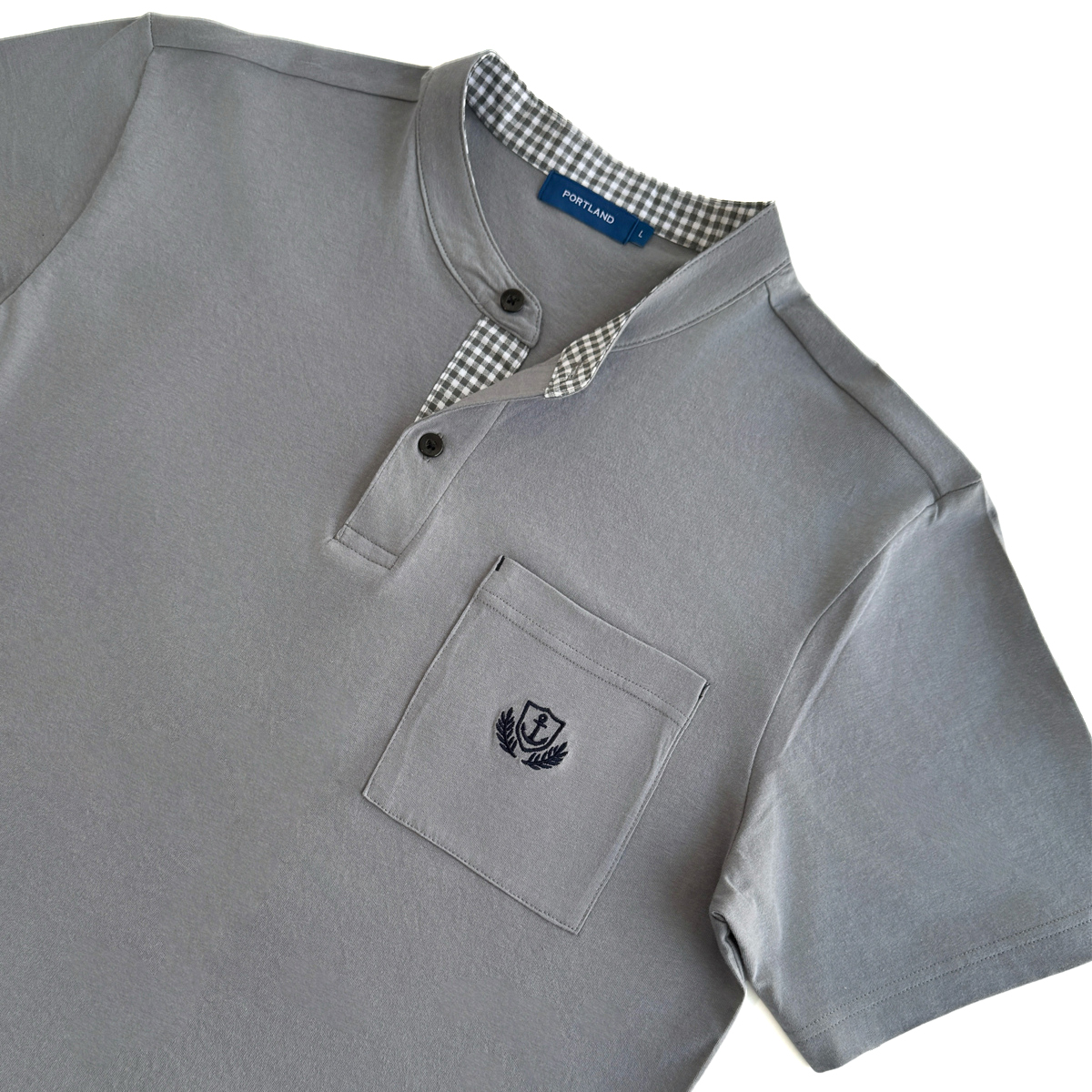 Henley Neck T-Shirt with Embroidery (50% Cotton, 50% Rayon) (Grey)