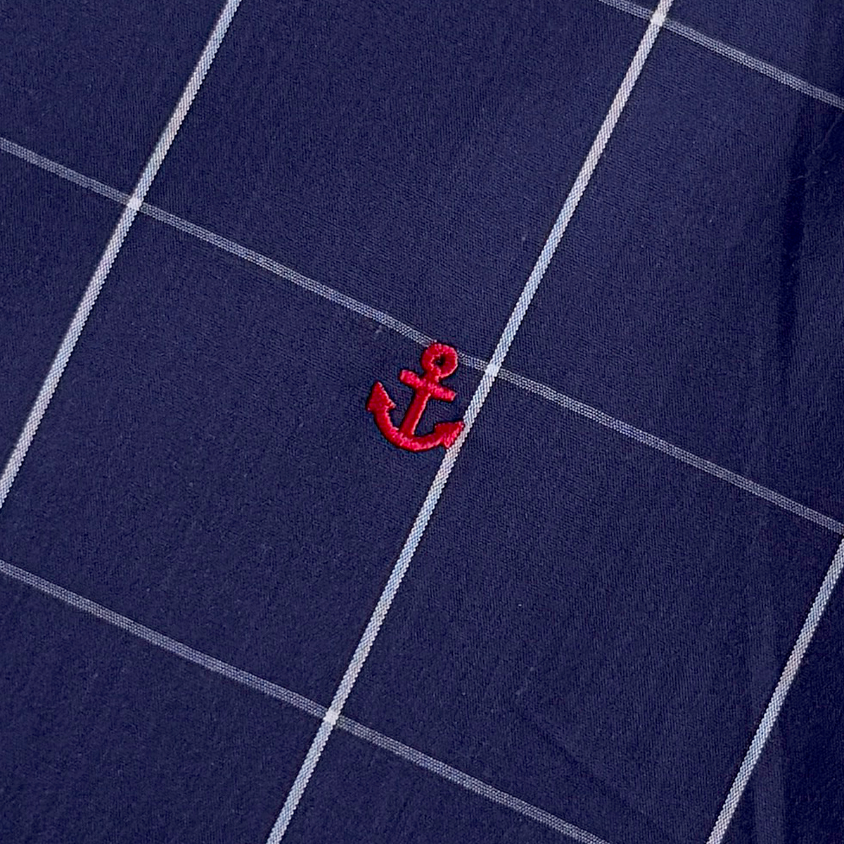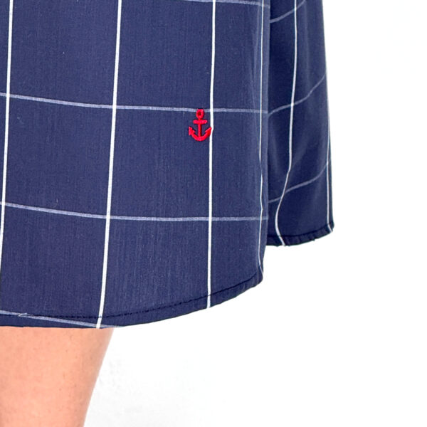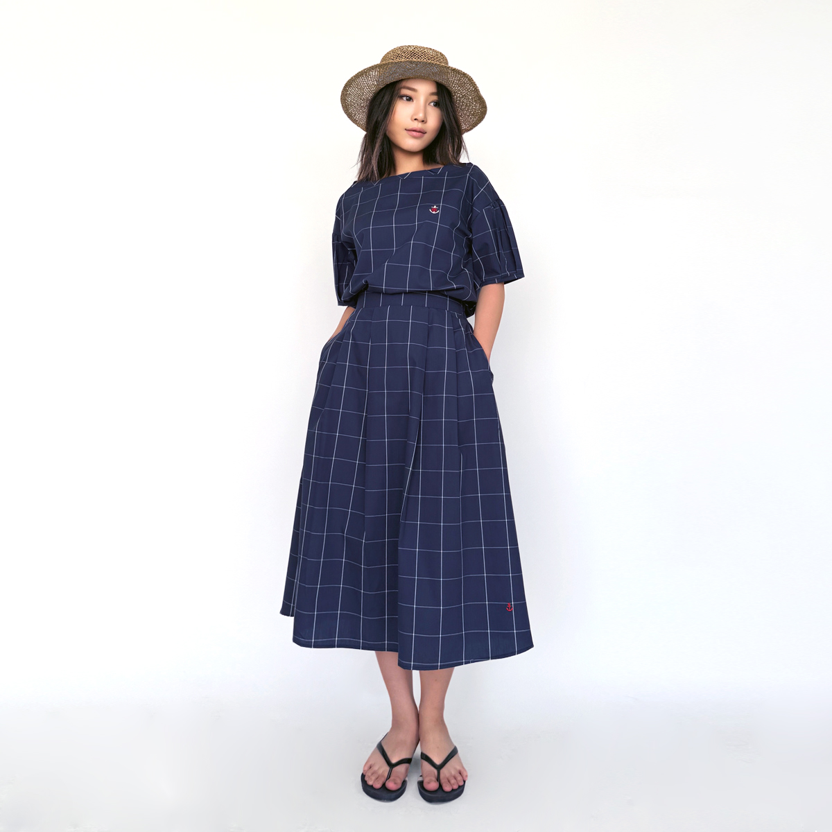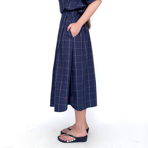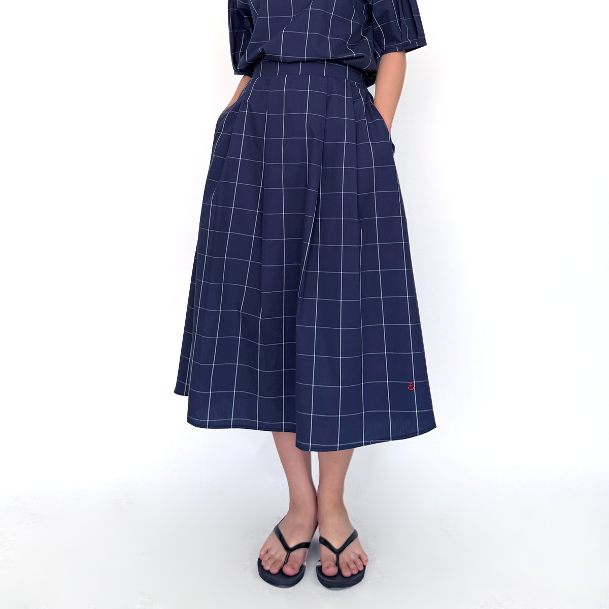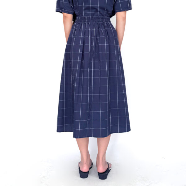 Plaid Midi Skirt Elastic Waist (55% Cotton, 45% Polyester) (Navy)