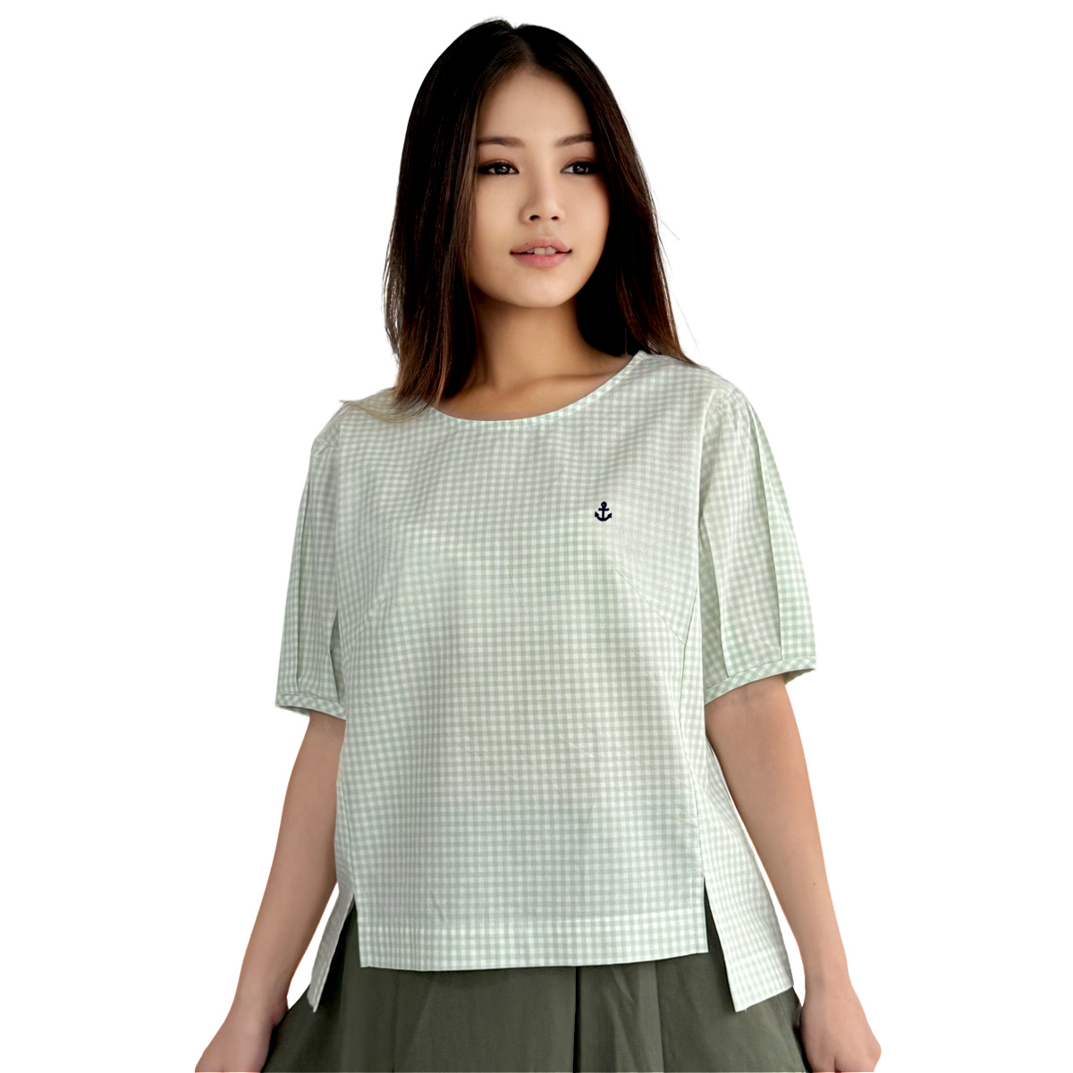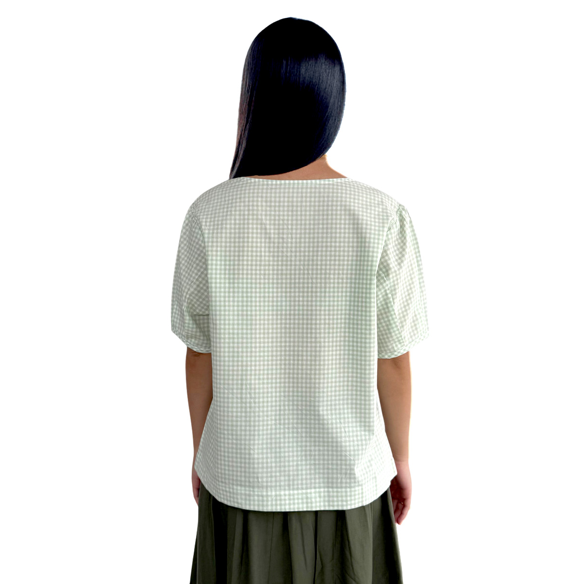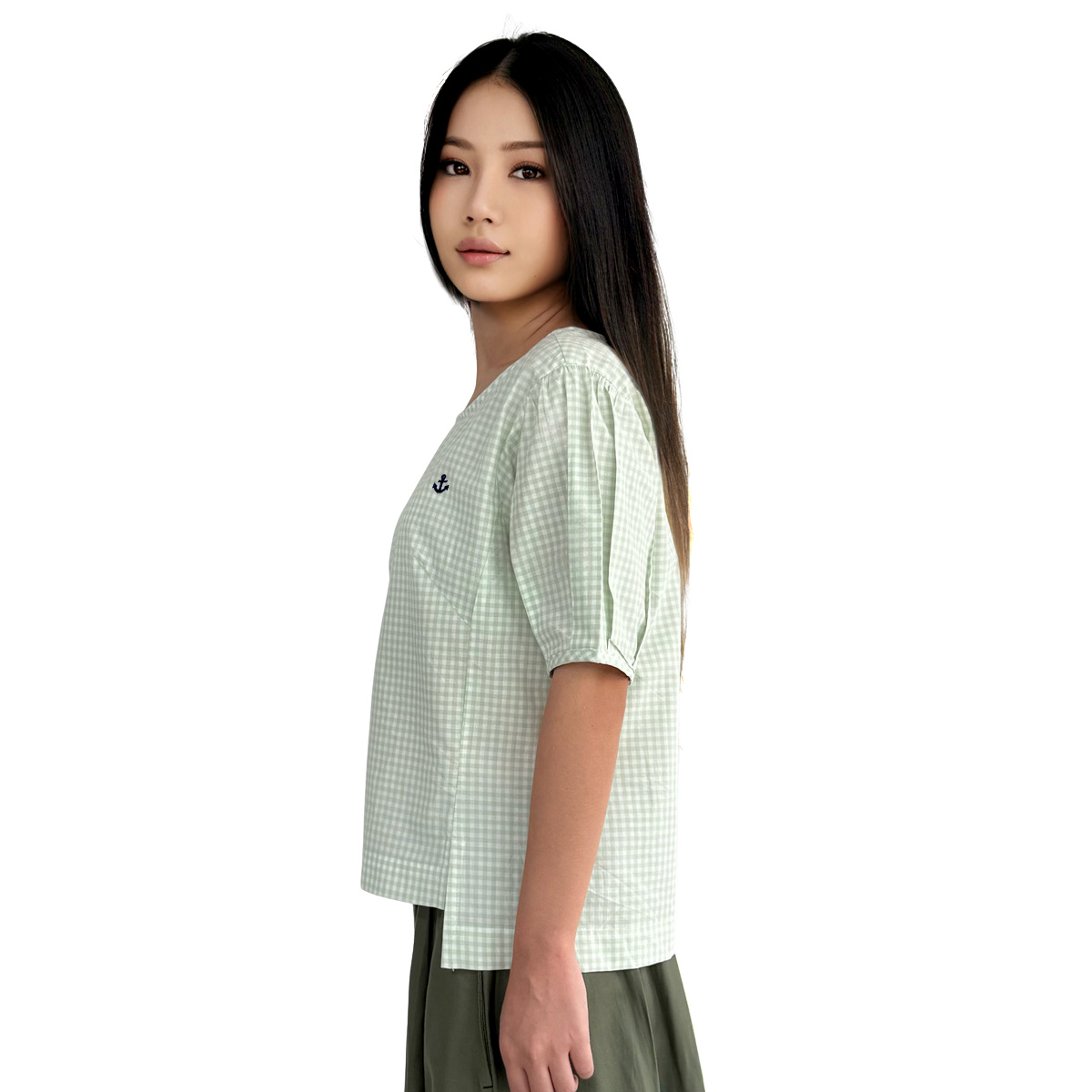 Puff Sleeve Plaid Blouse (55% Cotton, 45% Polyester) (Green)