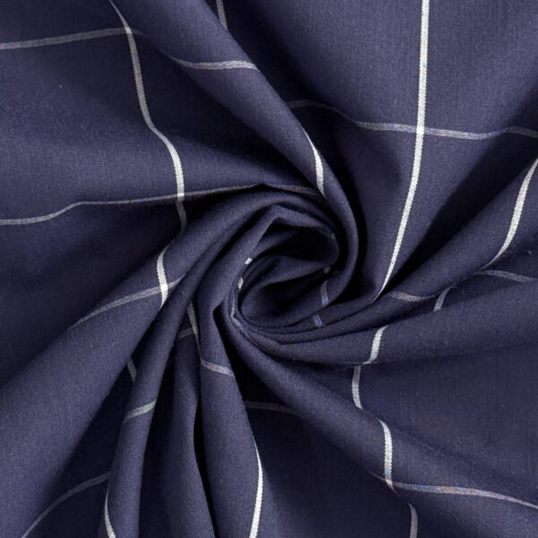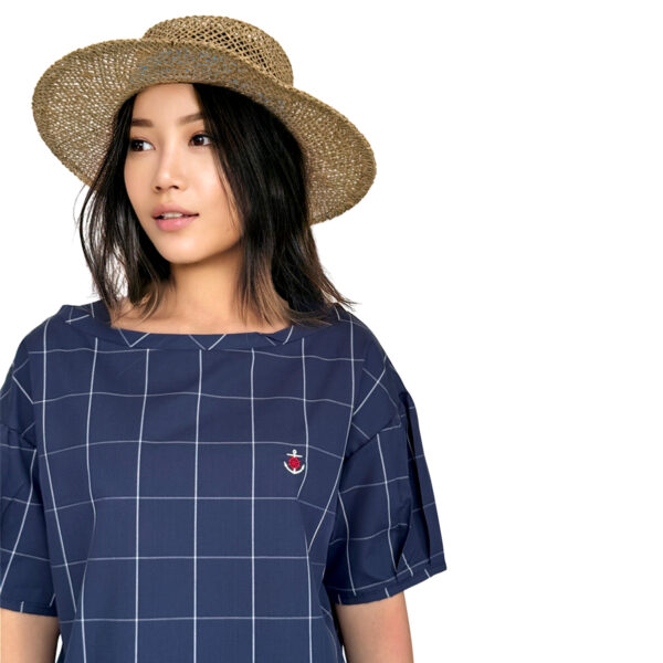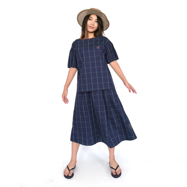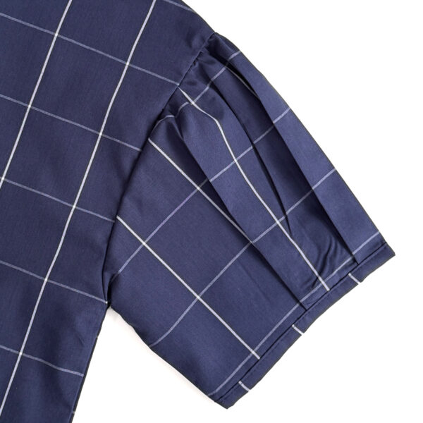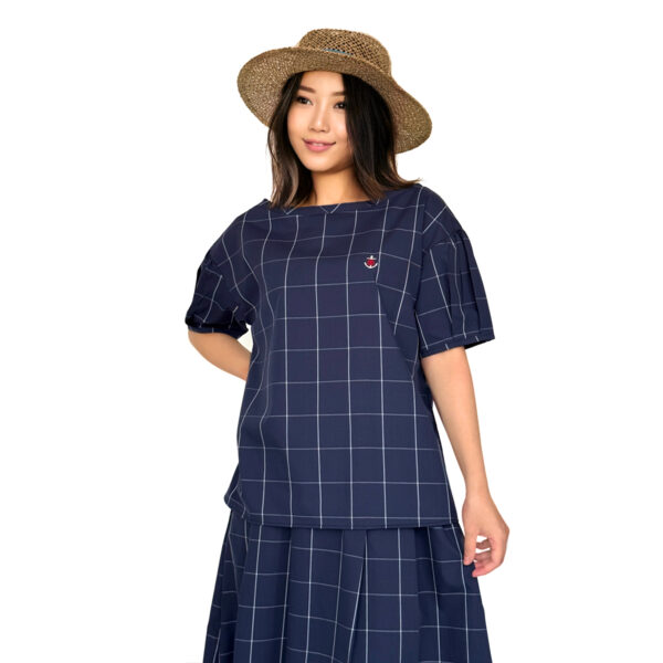Puff Sleeve Plaid Blouse (55% Cotton, 45% Polyester) (Navy)