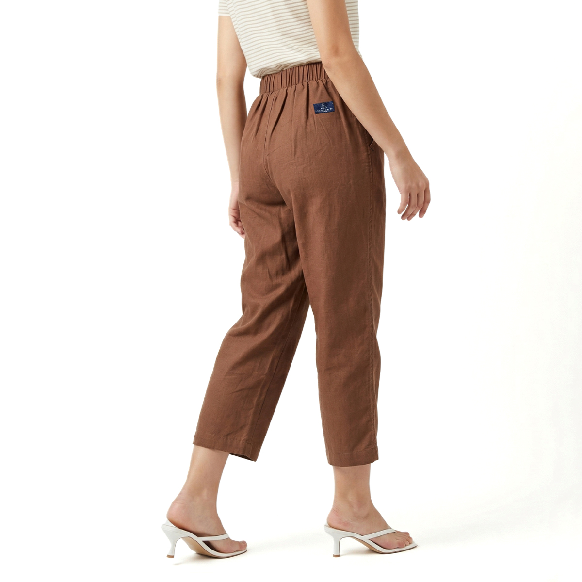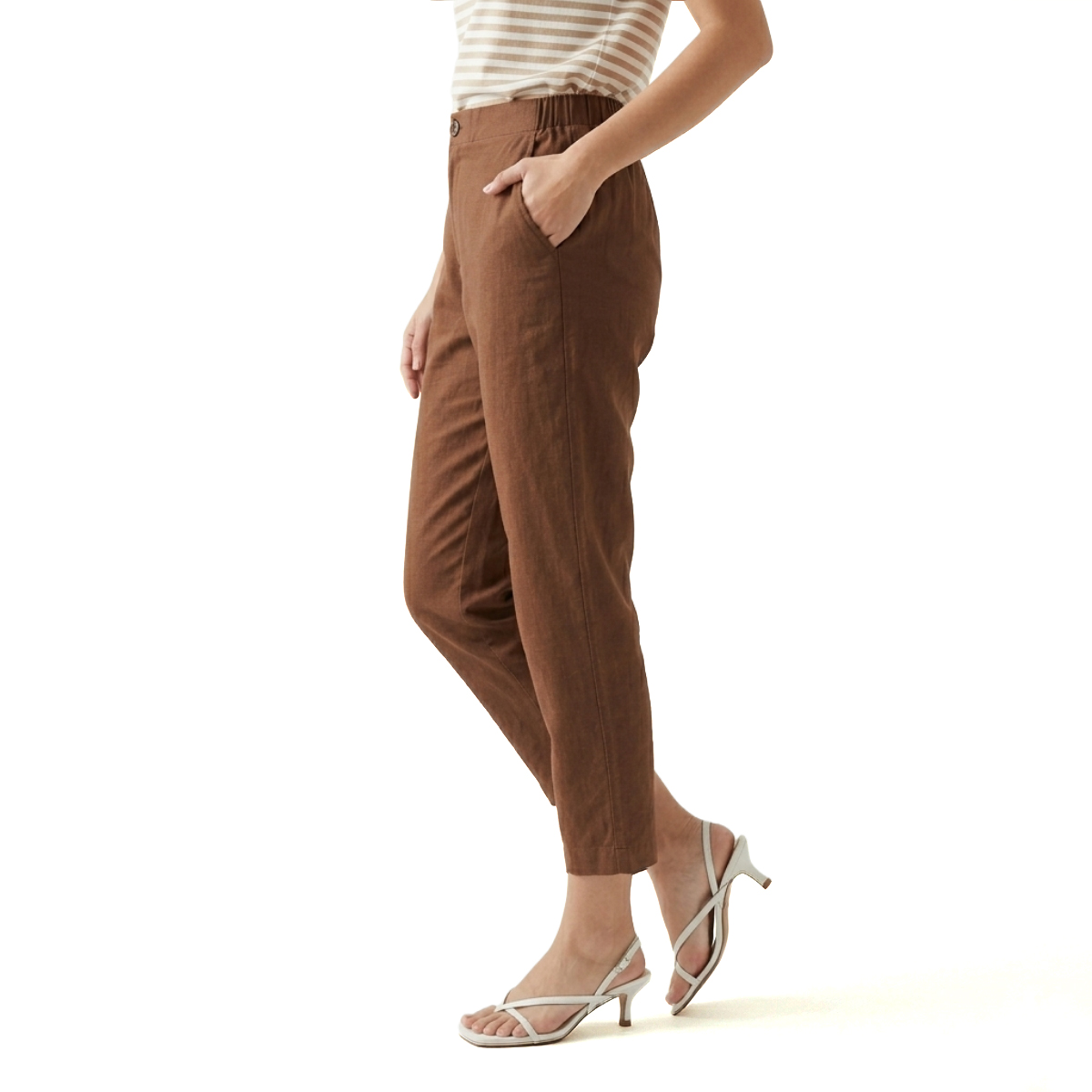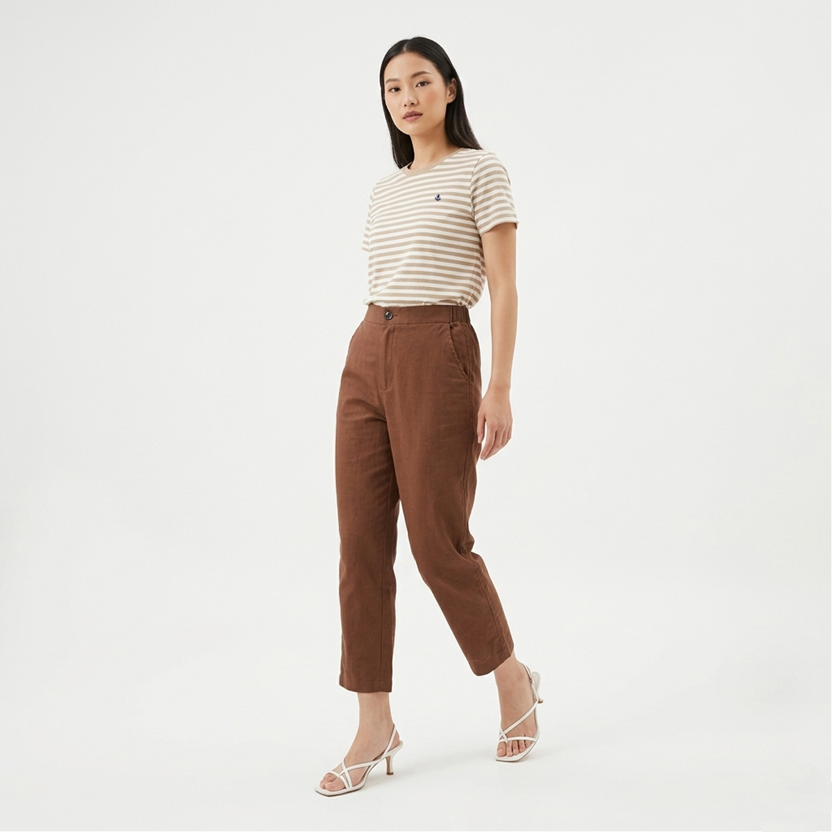Slim-Straight Linen Cropped Trousers (Cotton 70% & Linen 30%) (Brown)