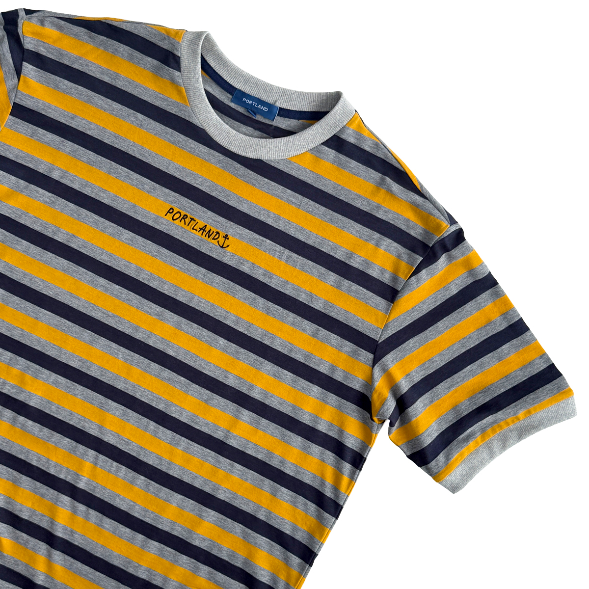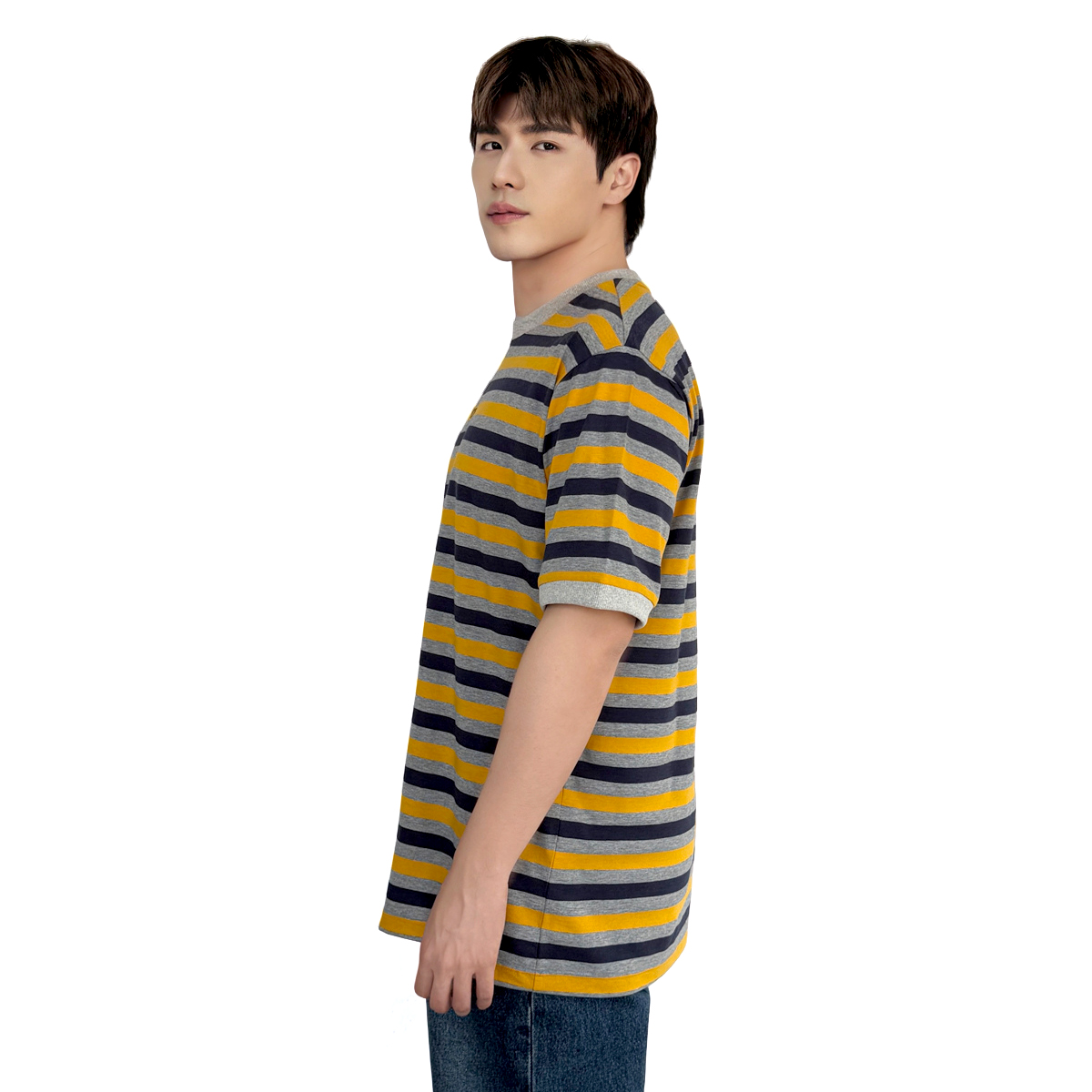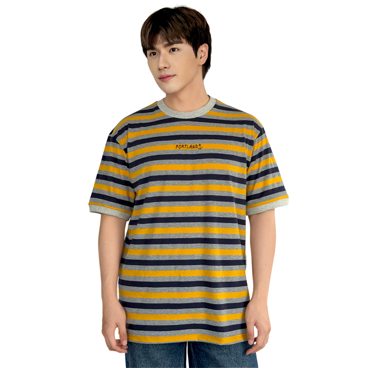 Striped T-Shirt with Embroidery (55% Cotton, 45% Polyester) (Yellow-Grey)