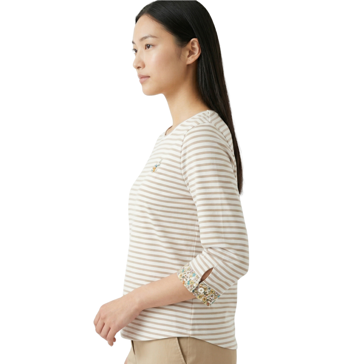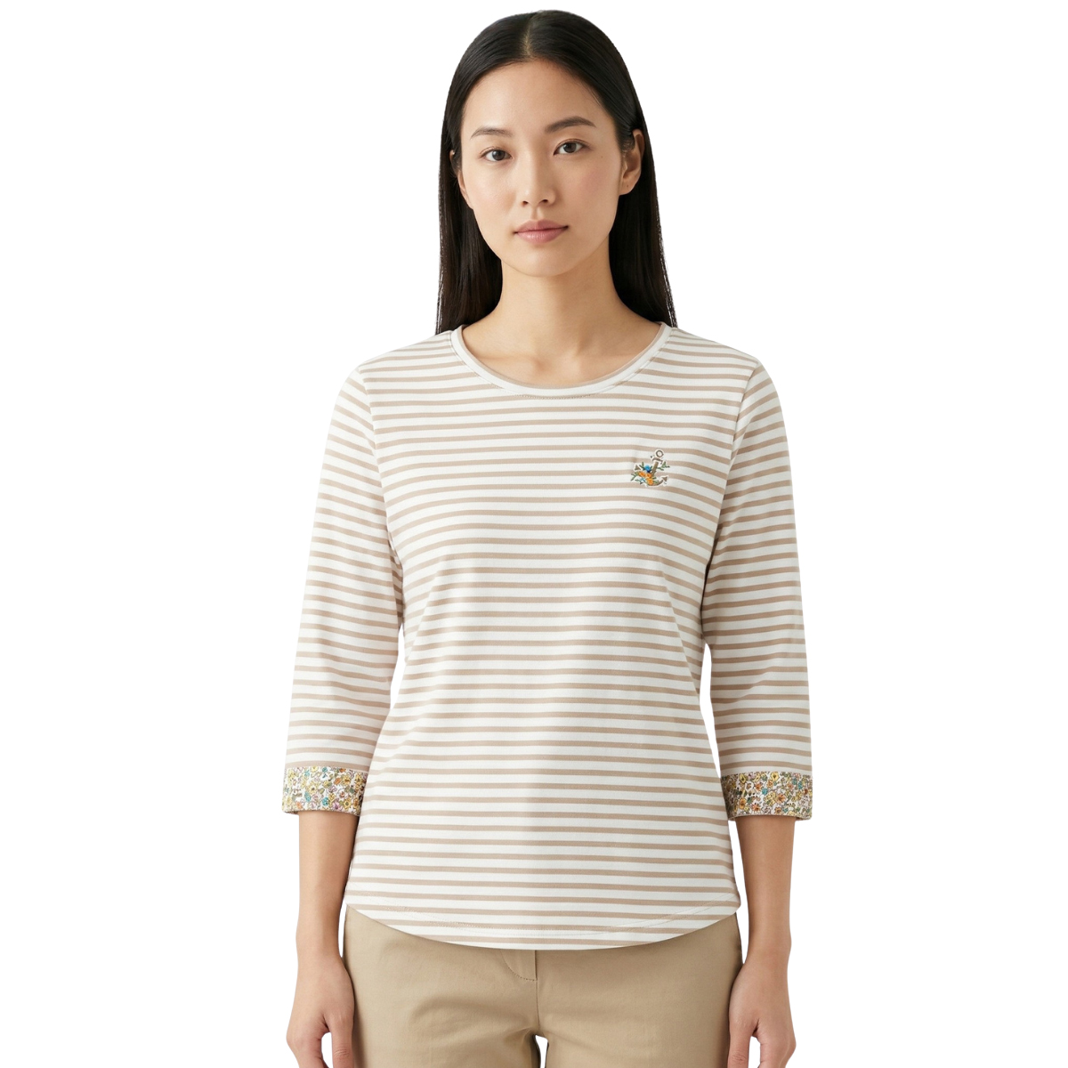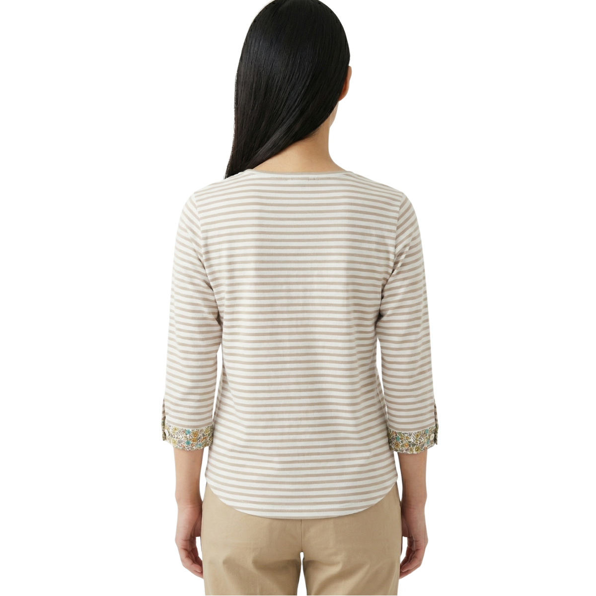 Striped T-Shirt with Floral Cuffs Detail (50% Cotton, 50% Rayon) (Khakhi)