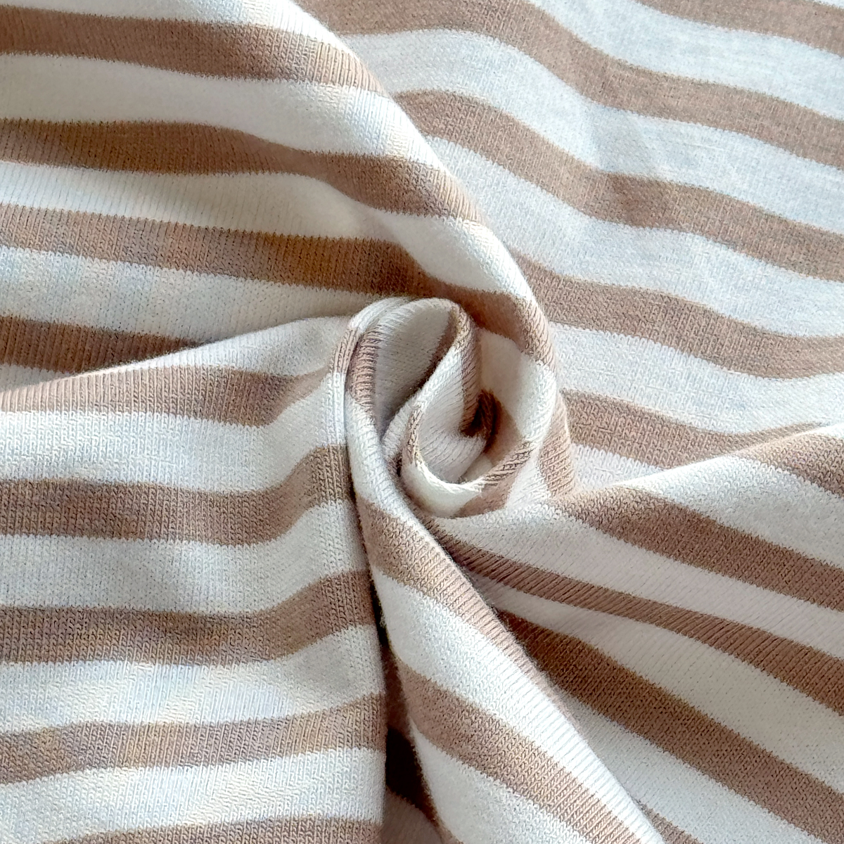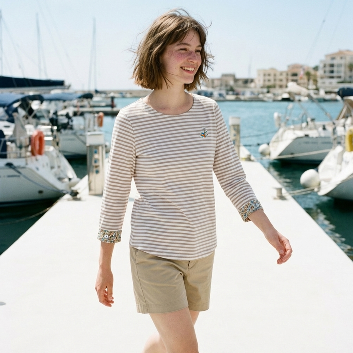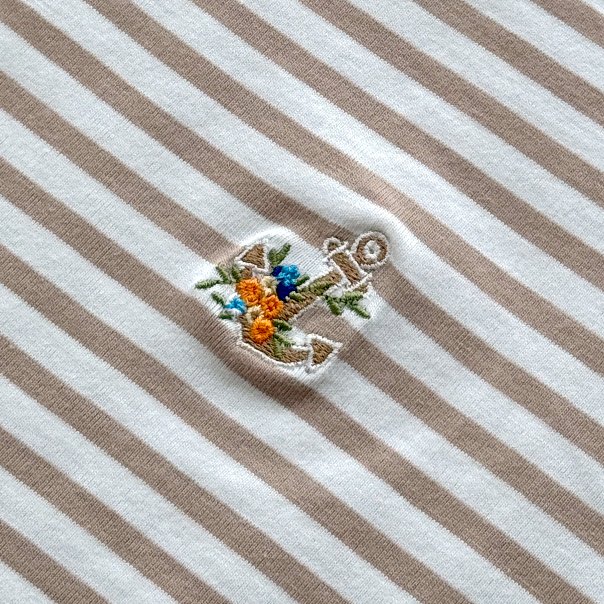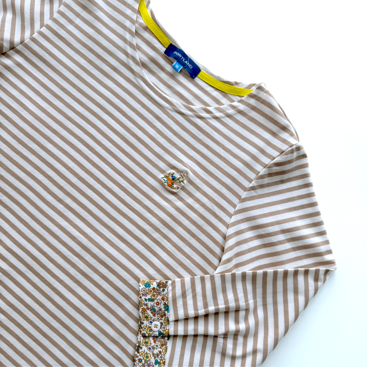 Striped T-Shirt with Floral Cuffs Detail (50% Cotton, 50% Rayon) (Khakhi)