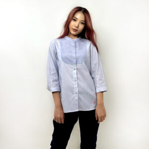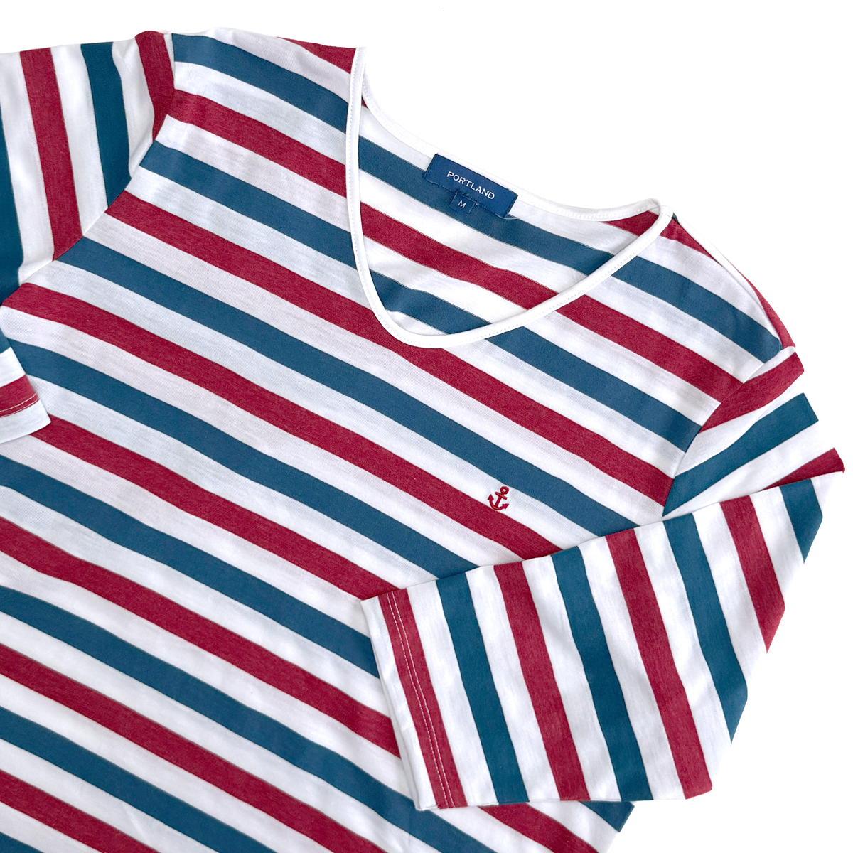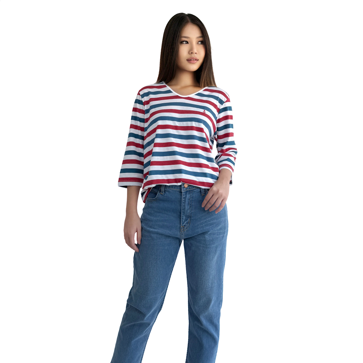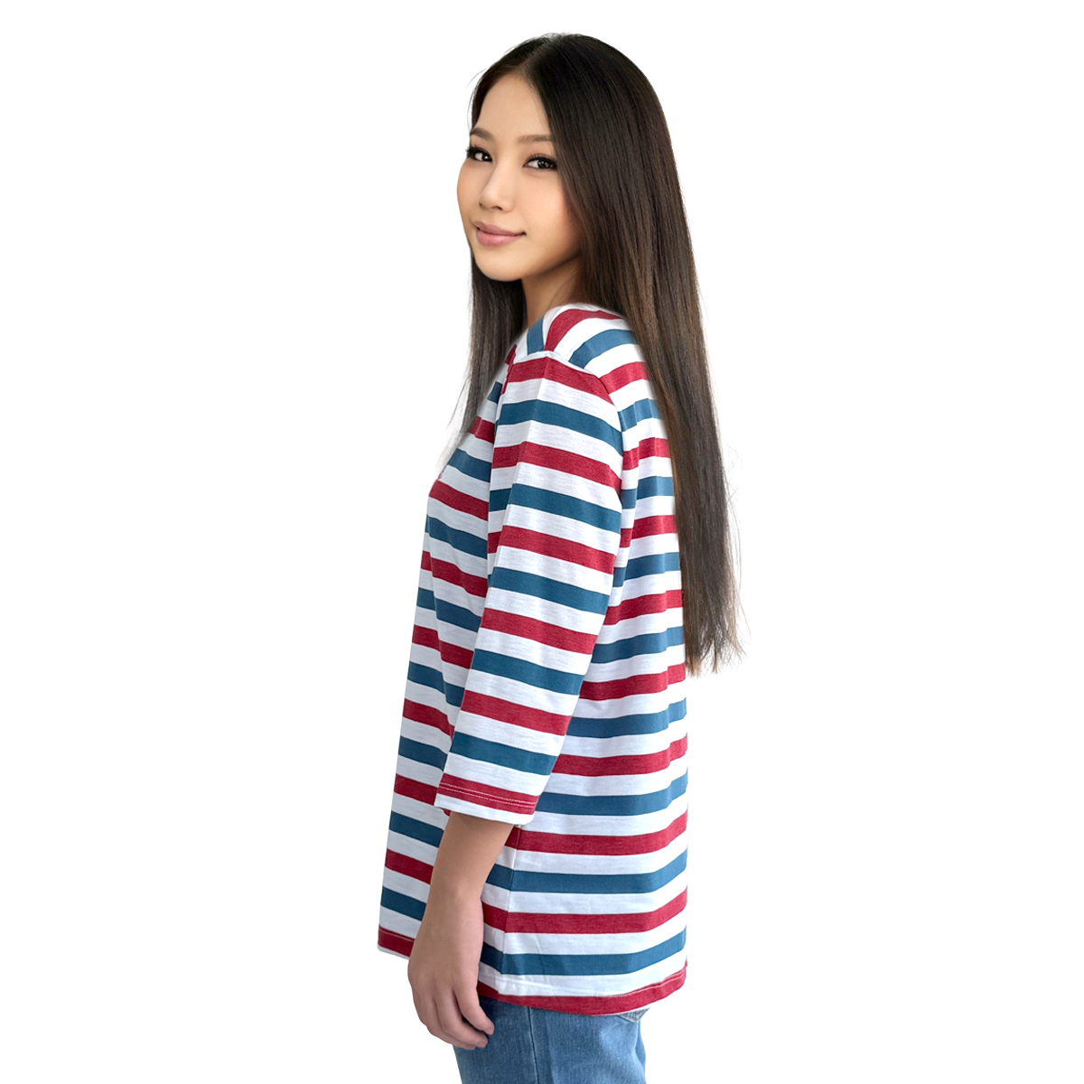 V-Neck Striped 3/4 Sleeves T-Shirt (55% Cotton, 45% Polyester) (Red)
